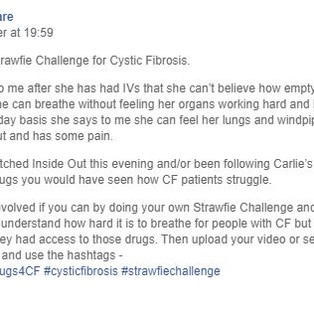 Use hashtags: #LifeSavingDrugs4CF #StrawfieChallenge #Fight2Breathe and many other hashtags to spread awareness.